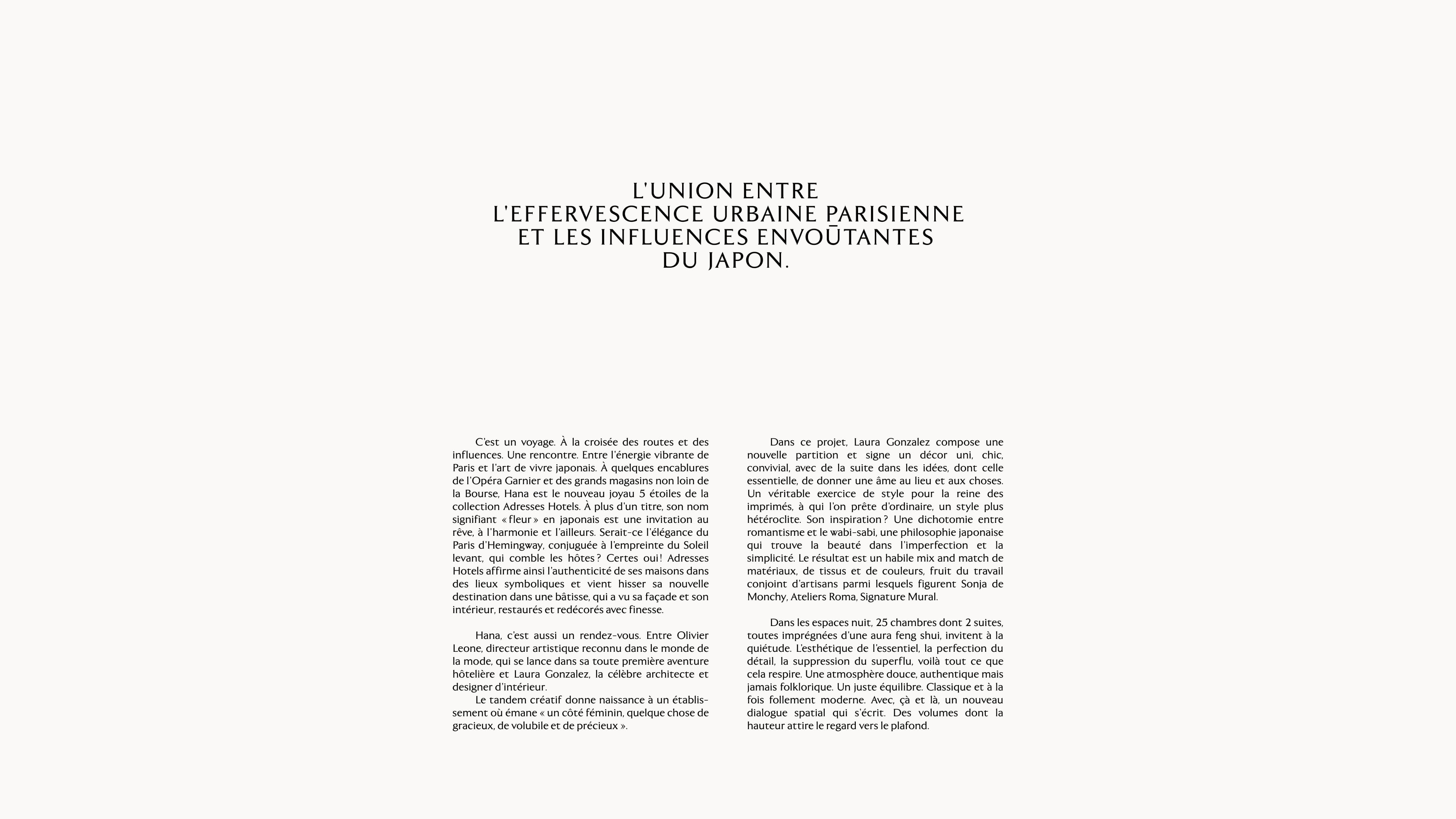 Hana is the intersection of Japanese minimalism and French Belle-époque maximalism. Hotel Hana is a five-star boutique-hotel in the heart of Paris' Opéra district. Designed by architect Laura Gonzalez and featuring a fusion cuisine restaurant curated by The Social Food's Shirley Garnier, Hana is a sanctuary for tourists and local alike.
